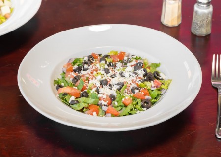 Romaine and iceberg lettuce, red onion, tomato, garbanzo beans and mozzarella cheese.